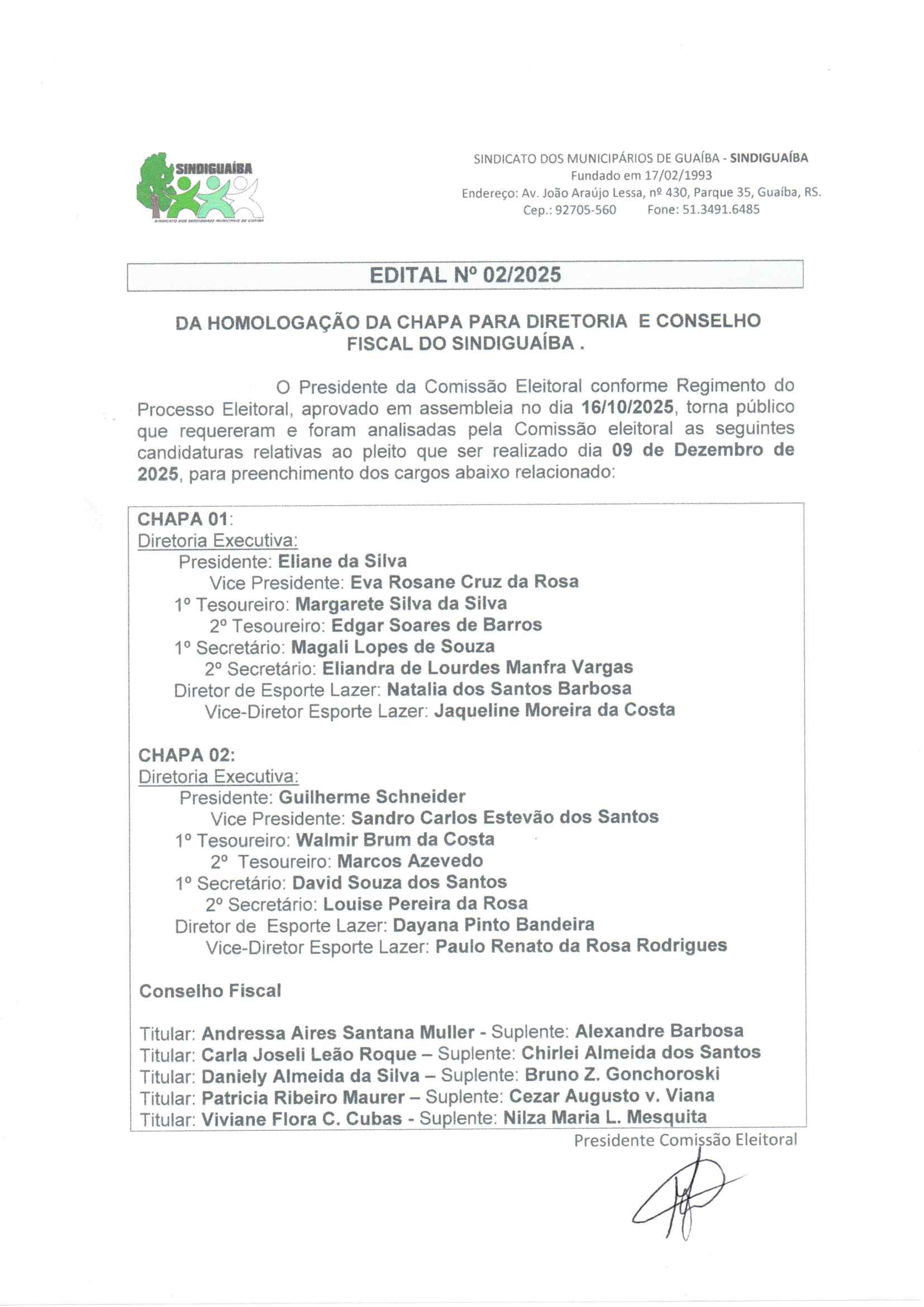 O Sindicato dos Municipários de Guaíba – SINDIGUAIBA torna pública a homologação das chapas que concorrerão às eleições para a Diretoria Executiva e Conselho Fi...
