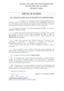 O Sindicato dos Municipários de Guaíba – SINDIGUAIBA, por meio de sua Comissão Eleitoral, publicou o EDITAL N° 01/2025 , convocando os associados para as eleiçõ...